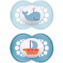 MAM Original Soothers | 16 Plus Months | Pack of 2 | Comes in Dummy Steriliser Box | Sustainable Materials | Baby Accessories | Blue (Various Designs)