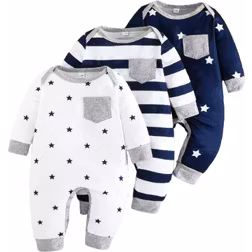 SHEIN 3pcs/Set Baby Boys Casual & Comfy Striped & Star Pattern Long Sleeve Romper Jumpsuit, Spring & Autumn