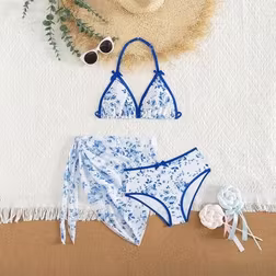 Shein Young Girls Floral Print Bikini Set With Cover-Up Skirt