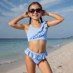 SHEIN Tween Girls Pleated Double Layer Bikini Set, Blue Special Fabric, Stylish & Elegant, Suitable For Swimming, Vacation, Summer Young Girl Summer Outfits
