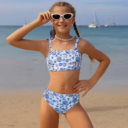 SHEIN Tween Girl Retro Blue & White Floral Print Bikini Set, Cute Bow Splice Beach Swimwear, Suitable For Summer Beach Holiday Swimming Summer Holiday