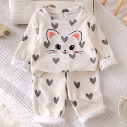 SHEIN 2pcs Baby Girl Heart And Cat Pattern Soft Fleece Crew Neck Long Sleeve Top And Pants Pajama Set, Comfortable Home Wear For Autumn/Winter