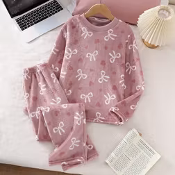 SHEIN 2pcs Girls Bow & Heart Print Fleece Long Sleeve Top And Pants Casual Comfortable Pajama Set Soft Pajama Set Long Sleeve Pajama Sets For Teen Girls Tee