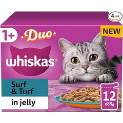 Whiskas Tasty Duo 1+ Surf and Turf in Jelly 48 x 85 g Pouches, Adult Cat Food, Pack of 4 (12 x 85 g)
