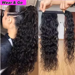 SHEIN Ponytail Extension Human Hair Water Wave Ponytail With Magic Paste Warp Around Long Brazilian Virgin Human Hair Ponytail For Women Natural Color 8-28