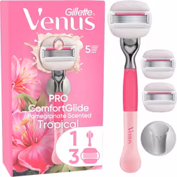Gillette Venus Razor, PRO ComfortGlide Pomegranate Scented Tropical 5 Blade Women's Razor + 3 Razor Blades + Shower Hook