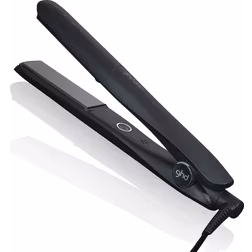 The GHD Gold Black hair straightener features dual-zone technology for consistent heat and smooth styling. Its streamlined design allows for easy use and efficient results.