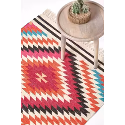 (160 x 230 cm) Manila Handwoven Pink, Orange and White Multi Coloured Diamond Patterned Kilim Wool Rug