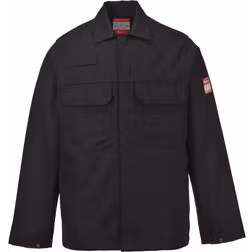 The Portwest BIZ2 Bizweld Jacket - Black is a flame-resistant work jacket with a concealed stud front and various pockets, designed for safety and practicality in demanding environ